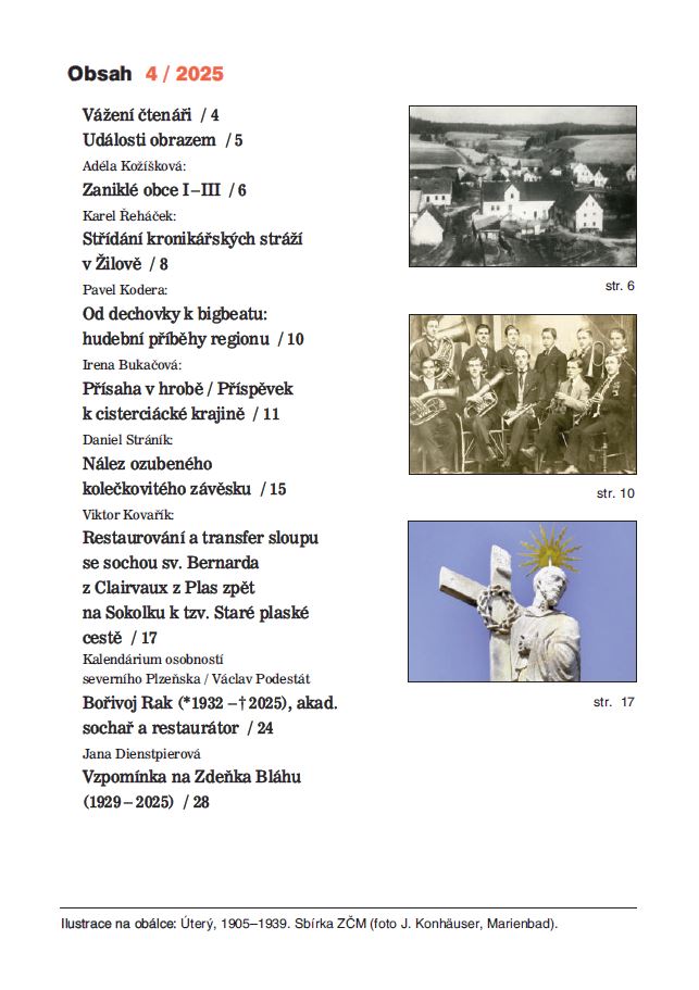 Čtvrté číslo Vlastivědného sborníku přináší příspěvky o nových publikacích, připomenut je zvyk doprovázející závažný okamžik pravdivosti vysloveného prohlášení, jiný článek pojednává o restaurování a transferu sloupu se sochou sv. Bernarda z Clairvaux z Plas zpět na Sokolku k tzv. Staré plaské cestě. Nechybí vzpomínka na Zdeňka Bláhu (1929–2025), zakladatele folklorního souboru Úsměv, dudáka, publicistu, emeritního člena redakce Českého rozhlasu v Plzni, sběratele a upravovatele lidových písní hlavně z oblasti Kralovicka, Plaska a Chodska. V kalendáriu osobností je vzpomenut akademický sochař a restaurátor Bořivoj Rak (1932–2025), jehož sousoší Zvěstování Panně Marii shlíží z kamenného podstavce ke každému návštěvníkovi východní apsidy kostela v Mariánské Týnici.